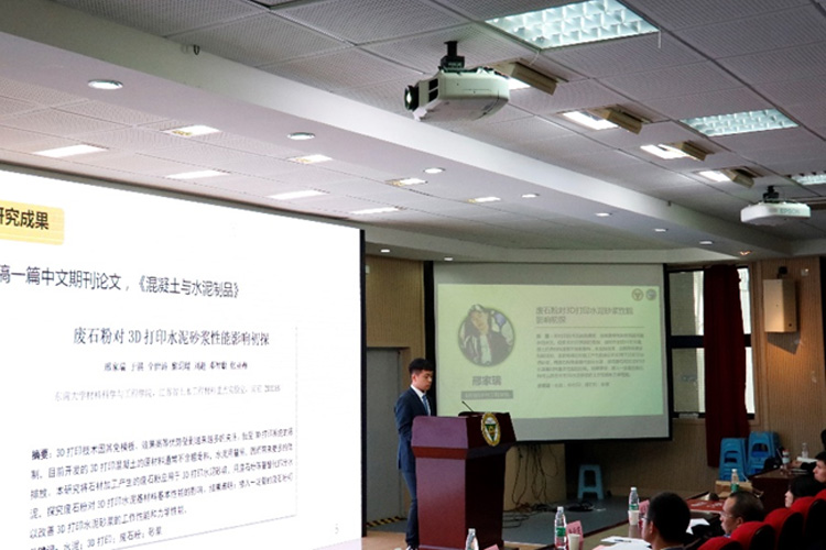 邢家瑞同学就“废石粉对3D打印水泥砂浆性能影响初探”展开讨论,目前开发的3D打印混凝土的原材料通常不含粗骨料,水泥用量高,会带来更多的碳排放,造成严重的环境污染问题。他们采用水泥、中国IOS标准砂、聚羧酸碱水剂粉剂、nano-SiO2(比表面积1.8×105m2/kg)、自来水作为原材料,掺入一定量的废石粉(主要成分为CaCO3,比表面积4833m2/kg),改变配合比进行测试,最终发现掺入一定量的废石粉可以改善3D打印水泥砂浆的工作性能和力学性能。点评交流环节,评委老师就掺量增加后,抗压强度并没有明显改变的问题、加入nano-SiO2的作用等问题进行点评交流。
