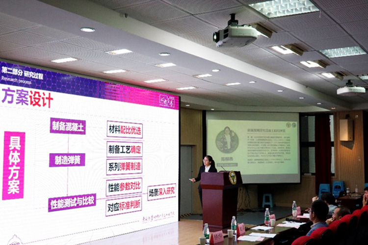 陈柳燕同学围绕“超高强高延性混凝土阻尼弹簧”这一主题,总结了超高强延性混凝土的高性能和经济效益,详细地阐述了超高强高延性混凝土阻尼弹簧的前期调研过程和后期制备方法及过程。并且介绍了从材料配比优选到制备工艺研究,再到弹簧抗压及数值模拟整个过程。结果表明,弹簧压缩阶段有较好的塑性形变平台,延性较好;卸载后重新加压,最大荷载可达100kN以上,展现出良好的抗压性能;弹簧两端出现细小裂纹,与ABAQUS软件模拟结果吻合。点评交流环节,评委老师就应用场景、脱模方法以及阻尼研究方向等问题进行点评交流。