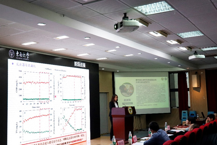赵润玉同学的汇报题目为“群体感应调控生物脱氮系统抗毒性胁迫的研究”,通过研究纳米颗粒的影响,她引入QS信息流对生物脱氮系统胁迫响应与性能恢复的耦合调控能力与作用机制研究,从微生物代谢途径和分子生物学层面,结合功能酶活性分析,为NPs胁迫下的污水处理工艺应急管理调控措施的确立开辟了研究新思想。为正确预测与全面评价NPs对污水生物脱氮系统潜在威胁、建立我国NPs排放限额与环境风险管控标准、促进受NPs胁迫污水处理系统有效应急管理调控策略与措施的确立提供必要的理论与技术支撑。点评交流环节,评委老师就成本问题、经济效益以及纳米颗粒的影响研究的研究价值等问题进行点评交流。
