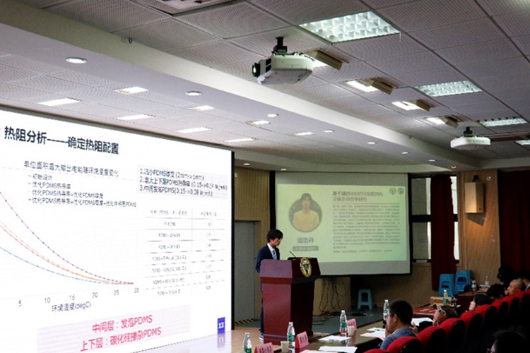 潘浩丹同学以“基于辐射冷却的可穿戴热电设备发电效率研究”为题,主要介绍了在小型化、集成化电子设备的快速发展情形下,医用植入式或可穿戴式电子设备技术的可研究性。而目前常见的可穿戴式电源一般采用热电发电技术,为解决常规的热电发电装置存在柔性不足与发电效率较低问题,他们提供了一种将辐射冷却技术运用于热电发电装置并采用柔性封装的移动电源设备,阐述了几种热电设备柔性封装方式及其相关特性,同时通过模拟与实验验证了将辐射冷却技术运用于可穿戴热电设备的可行性。点评交流环节,评委老师就如何设计中间层低热导率两端高热导率以及TEG冷热端的温差实现进行点评交流。