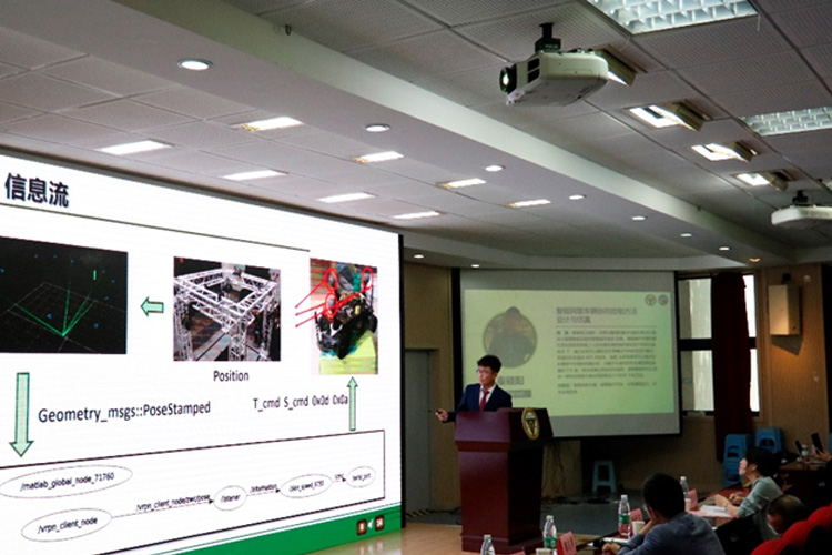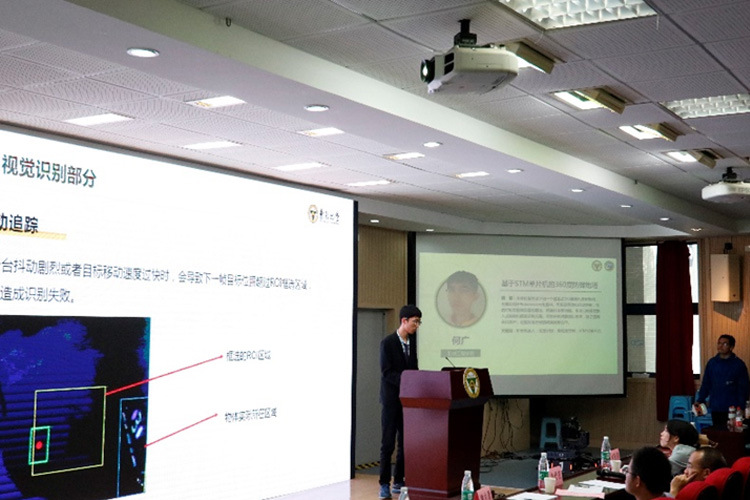何广同学在题为“基于STM单片机的360度42mm弹丸发射机构”的汇报中,从机构和算法创新出发,为实现结构设计目标:实现遥控式弹丸射击结构360度旋转;嵌入式控制射击目标:使得云台姿态调整快速、精确,弹道精准等;视觉识别设计目标:对目标进行快速瞄准,并对运动目标有一定的预判。他们设计出一个遥控式360度弹丸发射机构,可实现手动和自动控制,包括对射击目标的自动瞄准、精准打击等功能。点评交流环节,评委老师就摩擦力补偿问题以及对目标二维与三维转换问题进行点评交流。