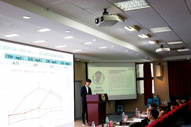 常朝阳同学关于“环境废物再生的轻质混凝土及其除磷效果探究”做出汇报,他指出磷是水体富营养化的主导因素之一,填料对磷的吸附作用被认为是最主要的除磷方式,研发新型高效的除磷填料是水处理技术中的重要方向。低密度混凝土通常作为建筑材料应用,其制备材料中水泥、石膏、石灰具有天然除磷特性。他们以表观密度600 kg/m3为低密度混凝土的配合比设计目标,提出了水泥、石膏、石灰、矿渣粉等基材配合比,实现并验证了轻质混凝土高效的吸附除磷功能。点评交流环节,评委老师就实际应用中吸附饱和问题以及孔结构的影响关系问题进行点评交流。