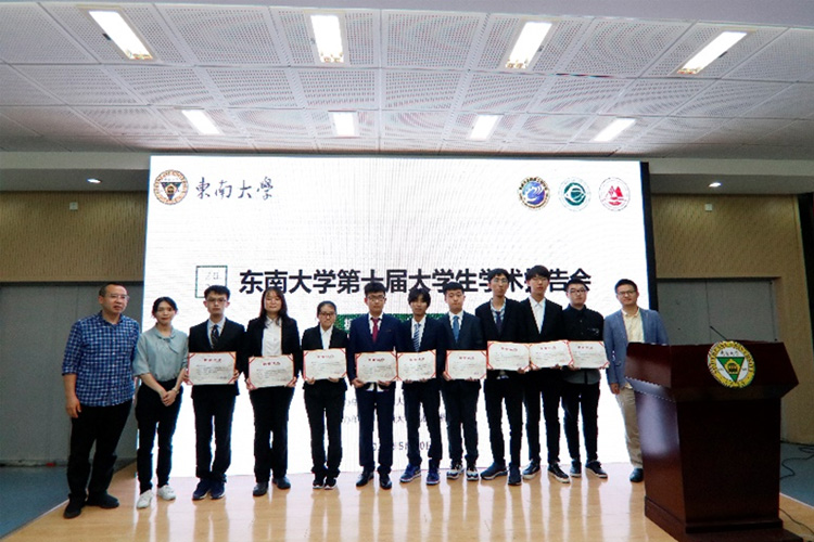 会议最后,3位评委老师上台为同学们颁发证书并合影留念,经评委老师讨论,蔡天佑同学“基于石墨烯纳米孔反电渗析盐差能发电研究”被推荐为本会场的“十佳报告”论文。