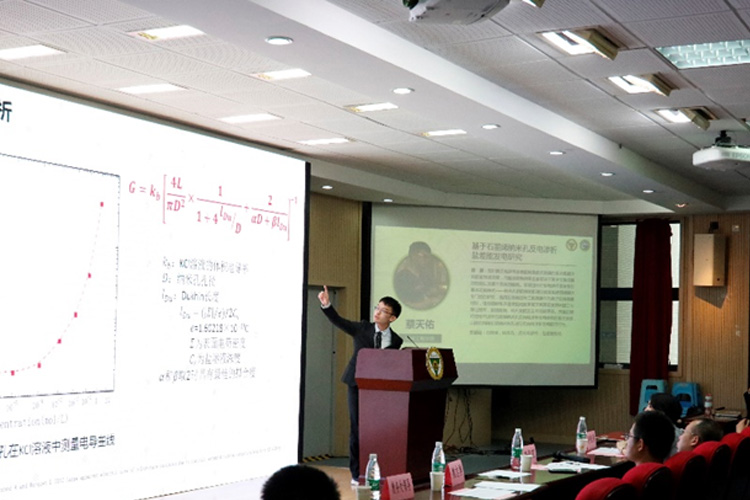 首先,由蔡天佑同学带来了题为“基于石墨烯纳米孔反电渗析盐差能发电研究”的主题汇报。他从项目背景、研究过程、项目总结三个方面展开汇报,现阶段反电渗析盐差能转换技术发展的重点是提升其能量转换效率,而能量转换效率主要取决于离子交换薄膜的性能以及整个系统的能耗。蔡天佑小组选用石墨烯这种二维薄膜作为离子交换薄膜材料,借助透射电子显微镜和聚焦离子束高精度纳米加工与表征技术,实现跨微、纳尺度的加工与性能表征。点评交流环节,评委老师就纳米孔和微米孔的发电的区别,转化效率与哪些因素,选用石墨烯的原因以及制备方法的复杂性对未来的实际应用等问题进行点评交流。