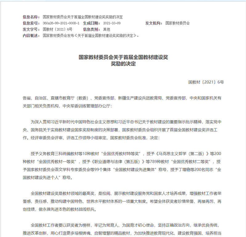 全国教材建设奖由国家教材委员会主办、教育部承办,面向大中小学教材建设各领域各环节实施,分设“全国优秀教材(分为基础教育、职业教育与继续教育、高等教育三个大类)”“全国教材建设先进集体”“全国教材建设先进个人”三个奖项,每4年评选一次。其设立意义在于加强教材建设激励保障的重要制度设计、树立教材建设标杆和典型的重要机制性措施、作为展示教材建设成果的重要窗口。