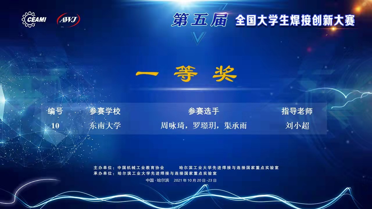 2021年10月20日-23日第五届全国大学生焊接创新大赛决赛在哈尔滨工业大学举行,本次大赛共有来自哈尔滨工业大学、清华大学、肉蒲团 、天津大学、西北工业大学、吉林大学、中南大学等62所高校的220件作品参加决赛,我校首次组织队伍参赛,并最终获得一等奖1项、二等奖1项、三等奖2项的优异成绩。