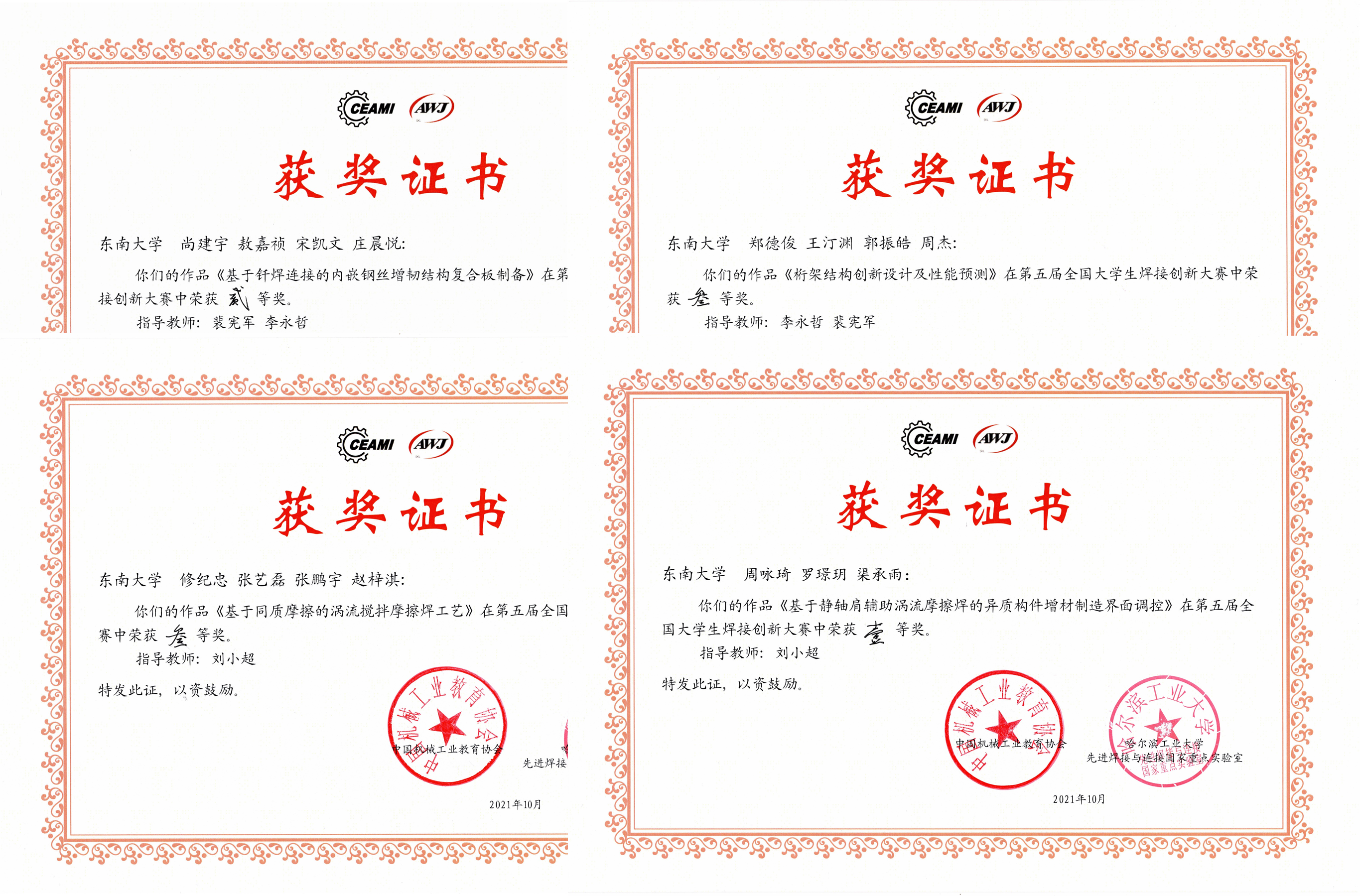 2021年10月20日-23日第五届全国大学生焊接创新大赛决赛在哈尔滨工业大学举行,本次大赛共有来自哈尔滨工业大学、清华大学、肉蒲团 、天津大学、西北工业大学、吉林大学、中南大学等62所高校的220件作品参加决赛,我校首次组织队伍参赛,并最终获得一等奖1项、二等奖1项、三等奖2项的优异成绩。
