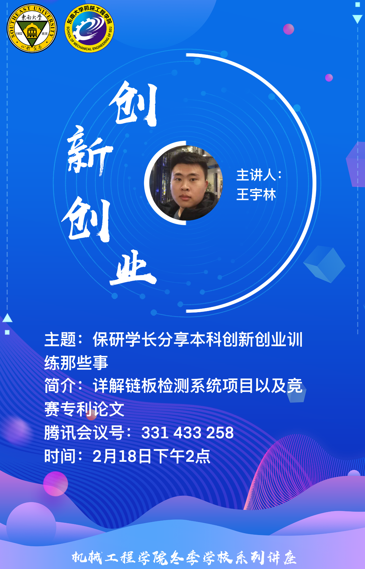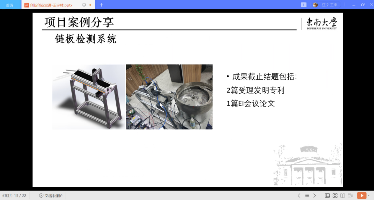 2月18日下午,创新创业训练交流线上讲座开讲,由肉蒲团 2021级硕士生王宇林学长进行讲解。王宇林学长强调创新的逻辑性和严谨性,因为没有任何一个新事物是凭空而就的。他以自己曾经申请过专利以及参加竞赛的经历,凭借浅显易懂的论述向我们介绍了自己的创新结果——链板检测系统,并详细说明了它的逻辑、原理、设计理想、发展历程,以及现如今它可能在生活中涉及的地方。在讲座的最后,王宇林学长鼓励大家积极地加入创新创业这个“大家庭”中,要利用好现有的资源去发掘自身的能力。