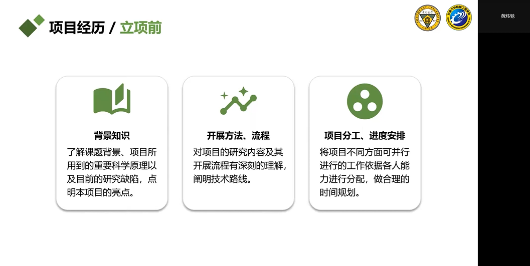2月16日下午,曾获得国创优秀结题的黄炜驰、秦楚晋两位学长为大家分享了SRTP项目相关的注意事项,其中黄炜驰学长重点讲述了开展SRTP项目的流程,包括选题、准备、答辩。秦楚晋学长则通过分享自己的的一段SRTP项目经历,为大家在项目选择以及队友选择方面提供了一些建议。两位学长细致入微的讲解,带给同学们许多宝贵的经验。本次讲座让低年级本科生深入了解了关于SRTP项目有关的信息,相信同学们可以从中得到宝贵的经验,在未来开展项目的时候能够一帆风顺,取得丰硕成果。