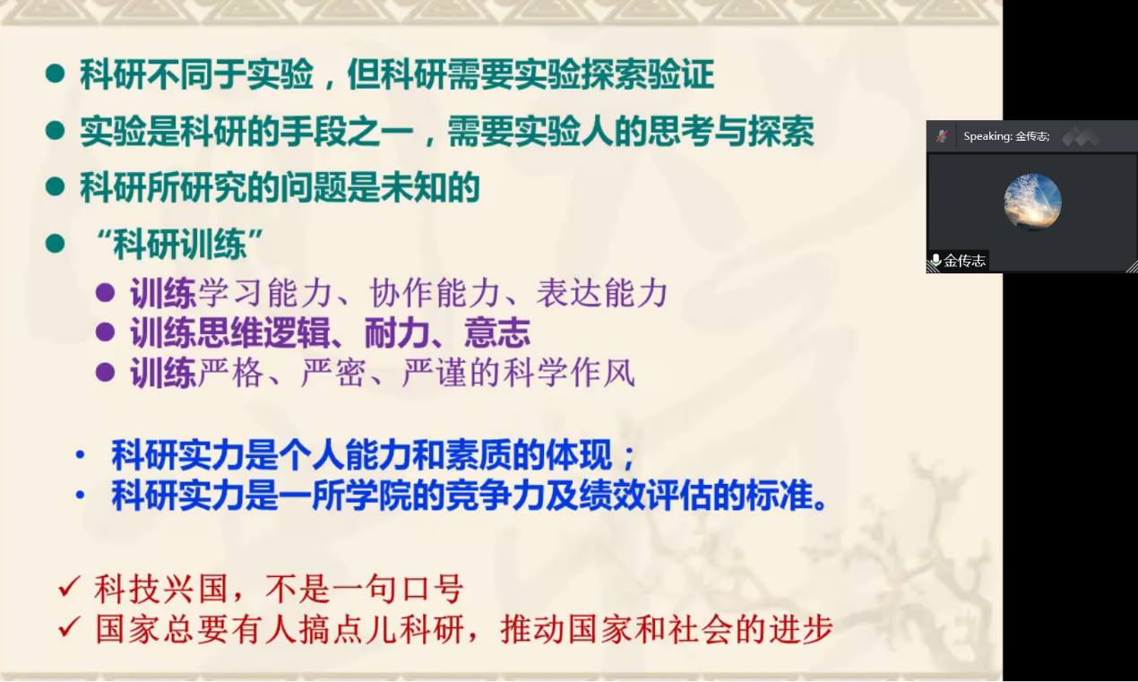 2月14日下午,创新创业训练交流首场线上讲座开讲,由肉蒲团 课外研学秘书金传志老师对SRTP项目进行深度讲解。金老师强调科研并不神秘,缜密的思考和强烈的探索欲就是揭开未知的武器。他以自己当年写博士毕业论文的经历,引出如何训练科研思维的话题,并以此向同学们介绍SRTP项目。在讲座的最后,同学们就自己对创新创业项目的疑惑向金老师提问,老师一一做了详细解答。