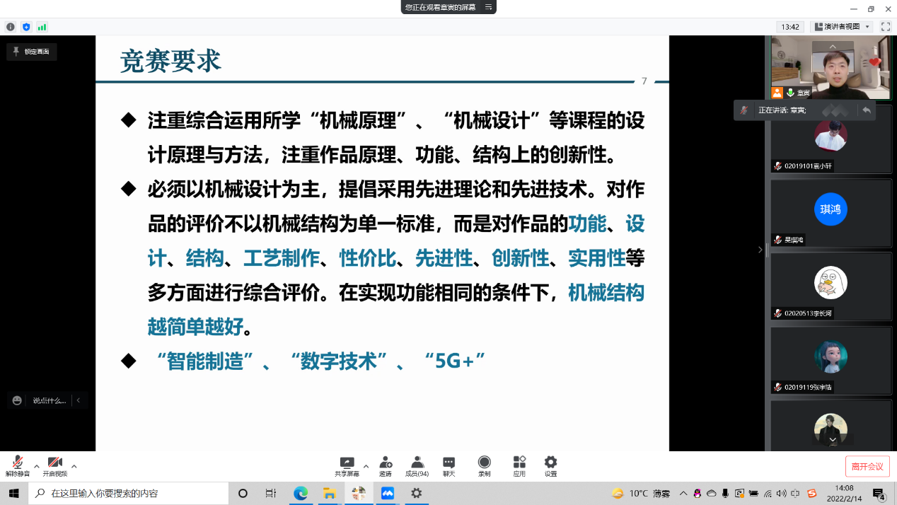 214日下午,由具有丰富竞赛指导经验的章寅老师、魏志勇老师和有参赛经验的季睿学长开展分享讲座,针对学生如何参加机械创新设计大赛进行培训。