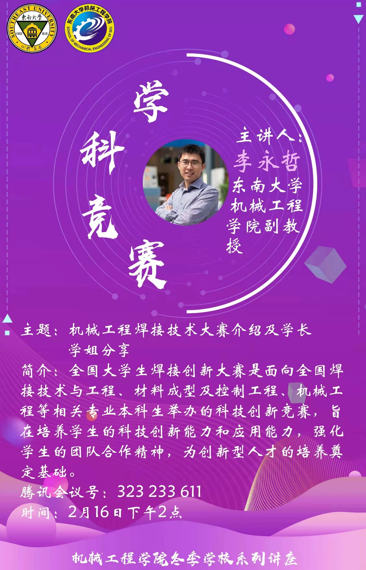216日下午,李永哲老师和具有参赛经验的周咏琦学长、庄晨悦学长开展分享讲座,针对学生如何参加焊接创新大赛进行培训。