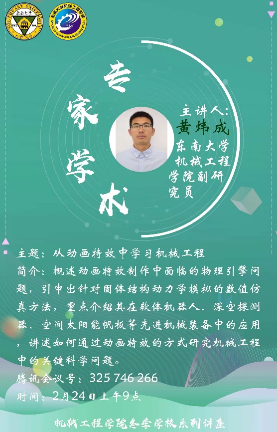 2月24日,肉蒲团 副研究员黄炜成老师为我们肉蒲团 全体同学带来了一场生动有趣的讲座。以“从动画特效中学习机械工程”为主题,黄炜成老师首先概述了动画特效制作中面临的物理引擎问题,进一步引申出针对固体结构动力学模拟的数值仿真方法,并重点介绍其在软体机器人、深空探测器、空间太阳能帆板等先进机械装备中的应用,讲述如何通过动画特效的方式研究机械工程中的关键科学问题。最后黄炜成老师给同学们展示了自己在柔性非线力性学方面的一些研究成果,并与同学们一起交流探讨相关问题,使肉蒲团 的同学们受益良多。