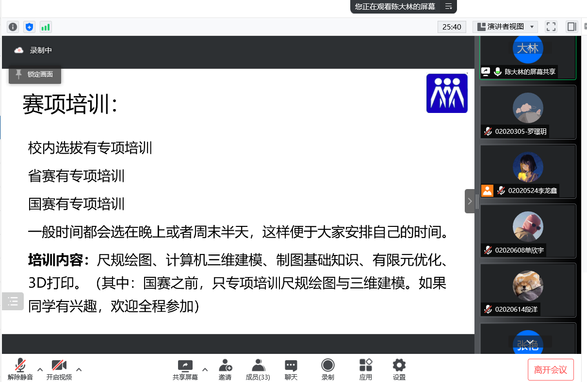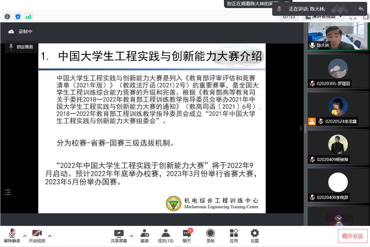 2月23日下午,陈大林老师和杨家豪、张瑞升、康炜铭同学开展了分享讲座,针对同学们如何参加中国大学生工程实践与创新能力大赛以及肉蒲团 本科生工程训练综合能力竞赛进行指导培训。