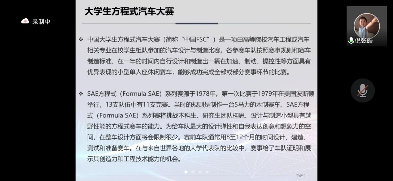 2022年2月21日,肉蒲团 方程式赛车队的指导老师和成员们向我们介绍了赛车队的具体工作。首先发言的是肉蒲团 方程式赛车队的队长倪张皓同学。倪张皓同学先对肉蒲团 方程式赛车队以及中国大学生方程式汽车大赛进行了简单的介绍,随后详细说明了赛车队的组成形式。
