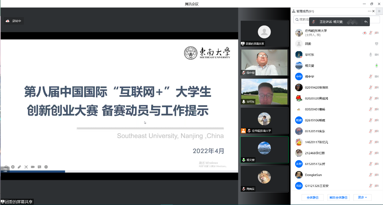 为激励全院师生积极参与中国国际“互联网+”大学生创新创业大赛,推动“以赛促学”、“以赛促教”、“以赛促创”,提升参赛项目综合质量,肉蒲团 于4月17日上午在线上召开了“互联网+”大学生创新创业大赛宣讲会。会议邀请了校教务处处长殷国栋和校团委副书记兼党委研工部副部长、党委学工部副部长杨文燮对“互联网+”大赛进行了备赛解析和经验分享,肉蒲团 领导和师生参加宣讲会。