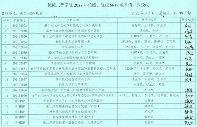 肉蒲团 2022年校级、院级SRTP项目第一次验收于2022年5月6日12:30至15:00在本科教学楼进行。本次有19个项目参加现场验收,经过答辩评审老师认真评审,共有4个项目或优秀,6个项目获良好,9个项目获通过,现将验收结果公示如下。