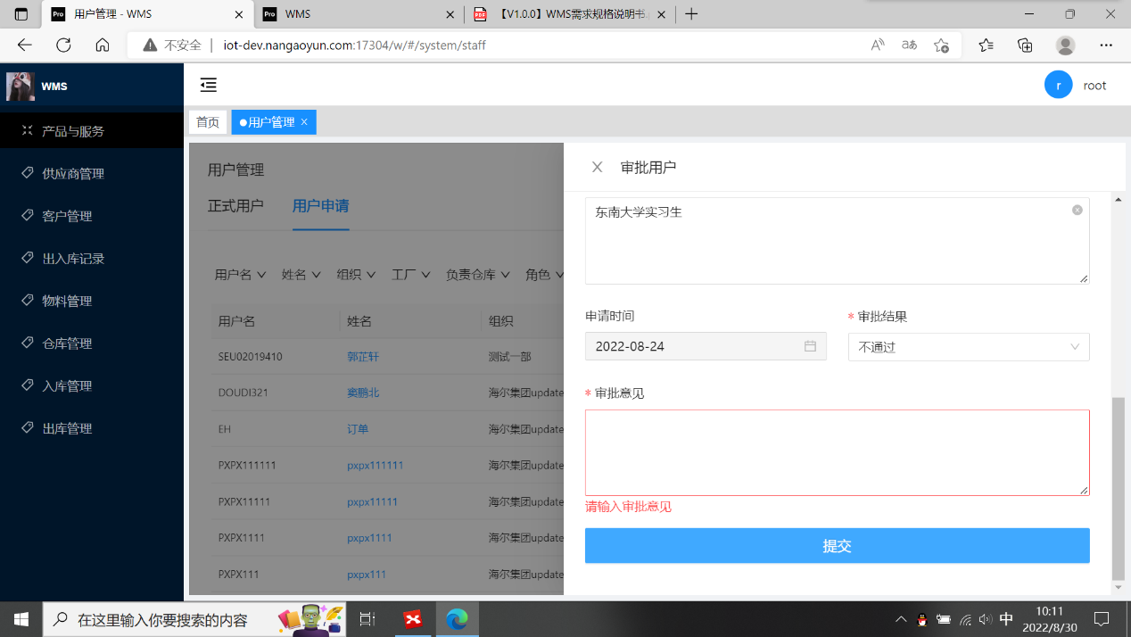 智能⼯⼚全流程业务,包括EMS、MES、WMS业务流程及测试验证。本项目主要完成智能工厂wms系统的web测试,熟悉系统功能,了解测试流程,发现系统问题并交回开发部门解决,使系统具备功能性、兼容性、易用性和安全性等。