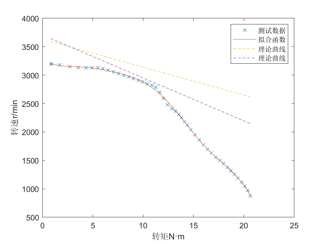 3.整理数据,记录空载点、最大扭矩点、最大输出功率点以及最高效率点处的各项参数数值,绘制扭矩-电流、扭矩-转速以及扭矩-效率等图像,将各组数据拟合为多项式函数,并结合电机铭牌参数与理论函数进行数据分析。