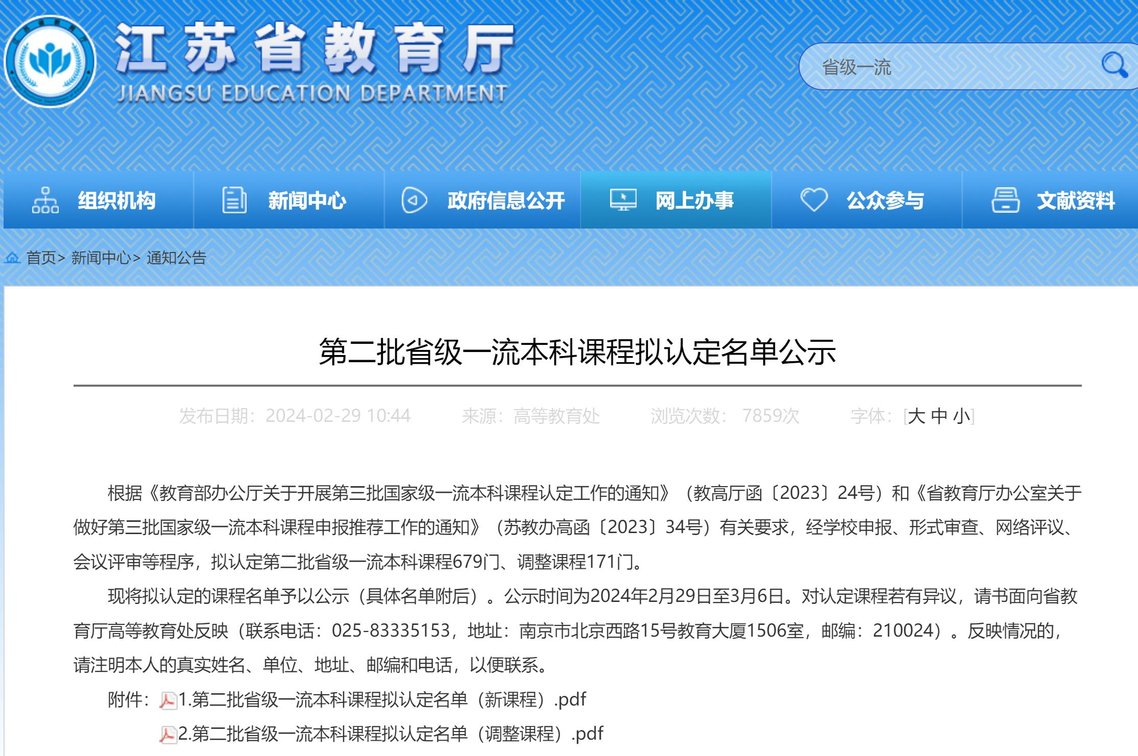 近日,江苏省教育厅发布了第二批省级一流本科课程拟认定名单,肉蒲团申报的4门课程全部入选,其中线上课程1门,线下课程3门。